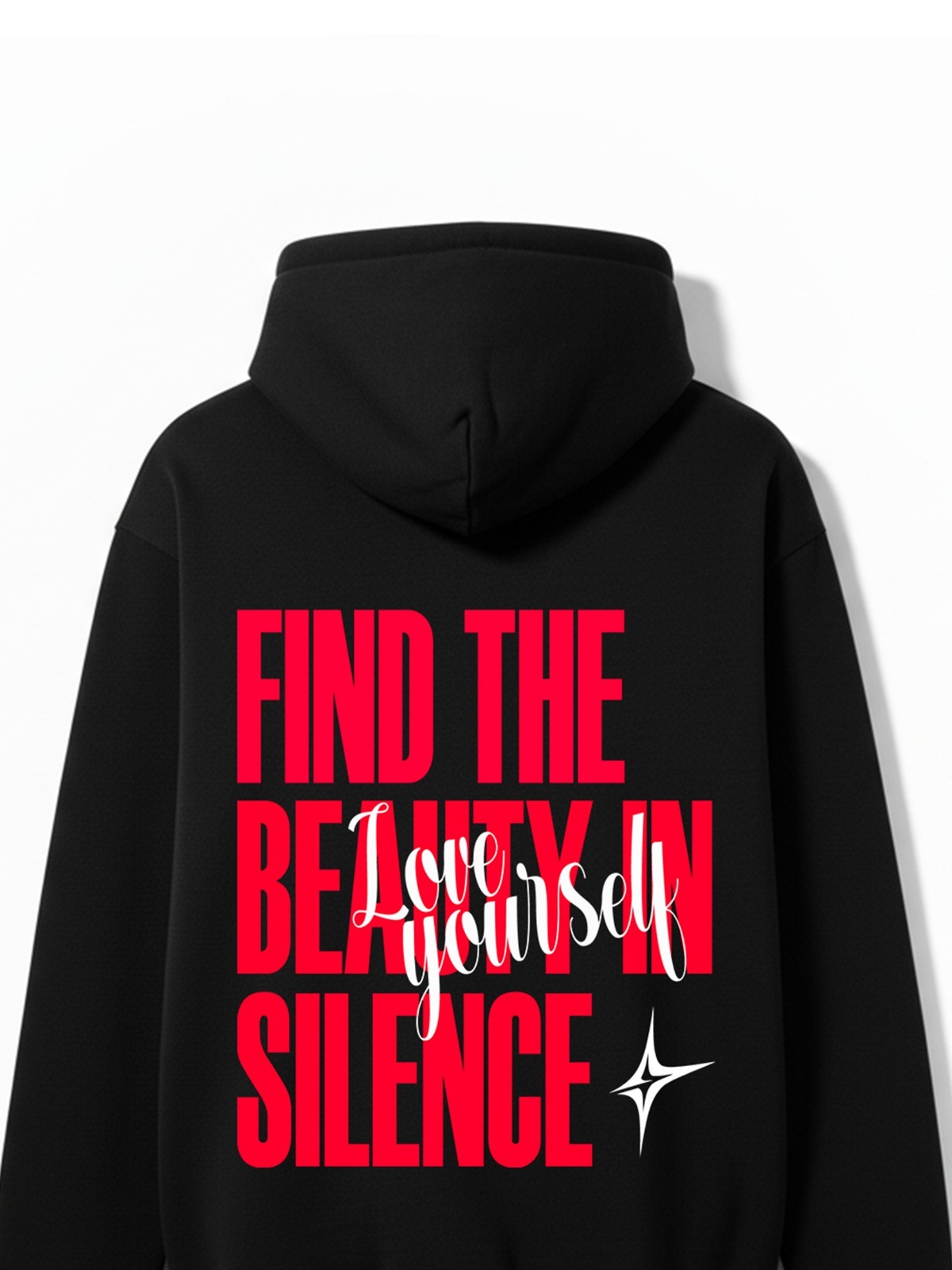 Step into confidence and calm with the Find the Beauty in Silence Hoodie a bold statement piece for those who embrace self-love and inner peace. Crafted in premium black cotton fleece, this hoodie features an empowering motivational quote printed in striking red and white typography. Stylish And Comfort. RivenRioOriginal