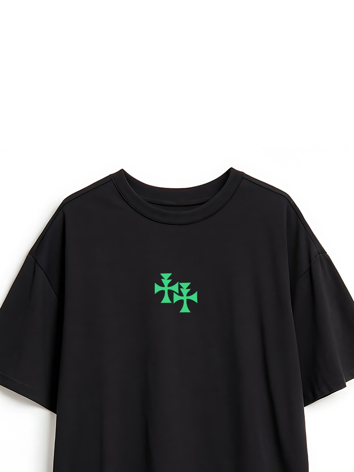 This black oversized tee features a striking neon-green artwork showcasing a mythical skeletal creature emerging from enchanted flora, crowned by a jellyfish-like spirit form. Surrounded by symbolic cross emblems, the design blends ancient tribal mysticism with modern streetwear. Black oversized graphic T-shirt Soft cotton or cotton-blend fabric, breathable and comfortable. Stylish And Comfort. RivenRioOriginal
