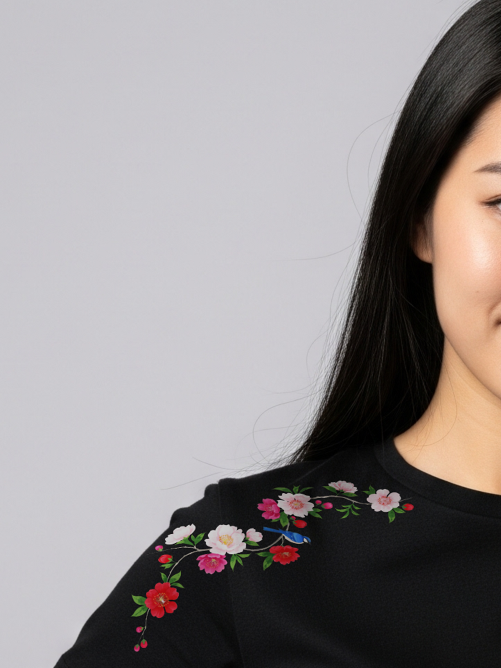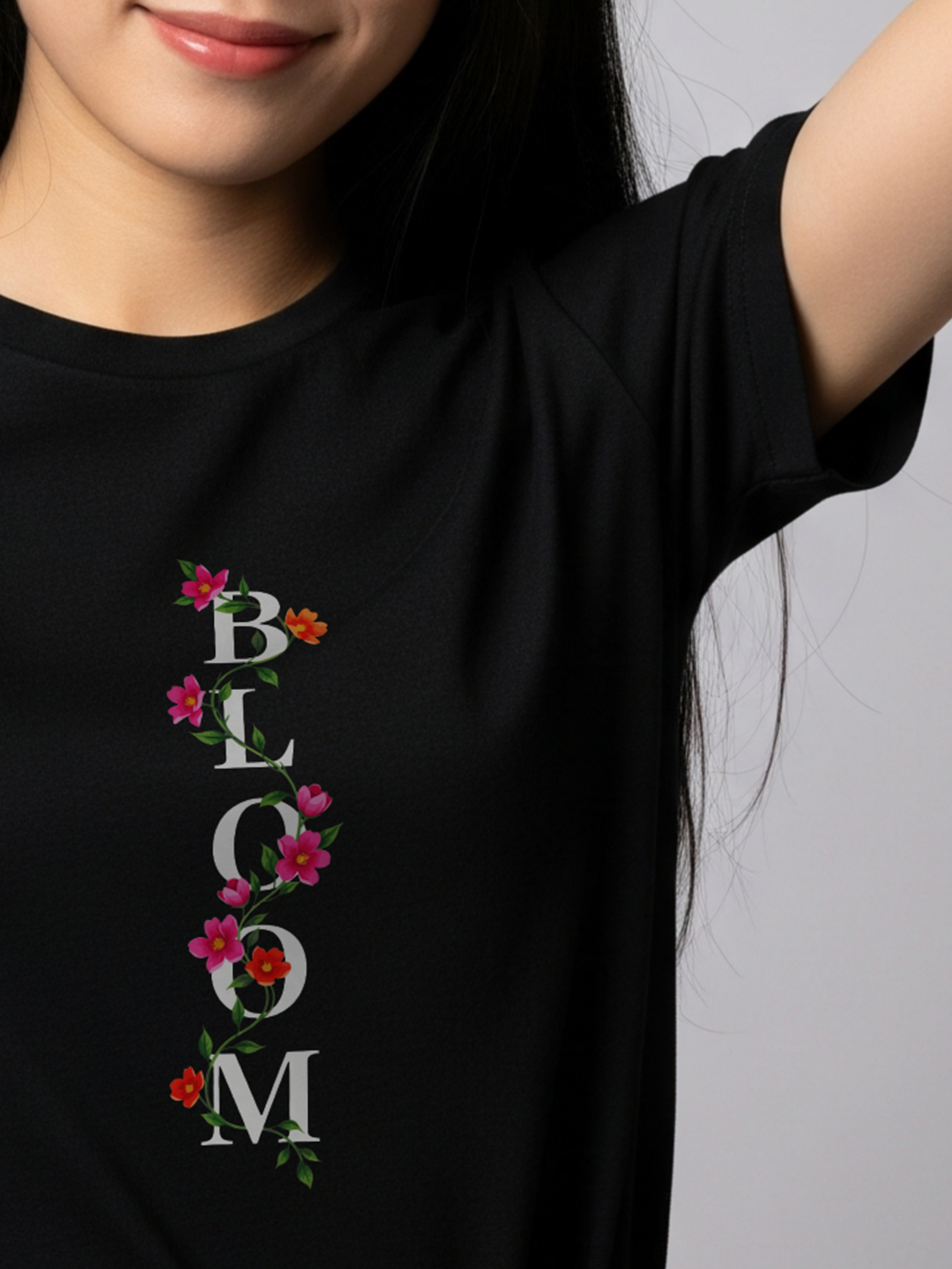 Round Neck Pure Cotton Black Regular Fit Bloom Printed T-Shirt. Stylish And Comfort. RivenRio Original