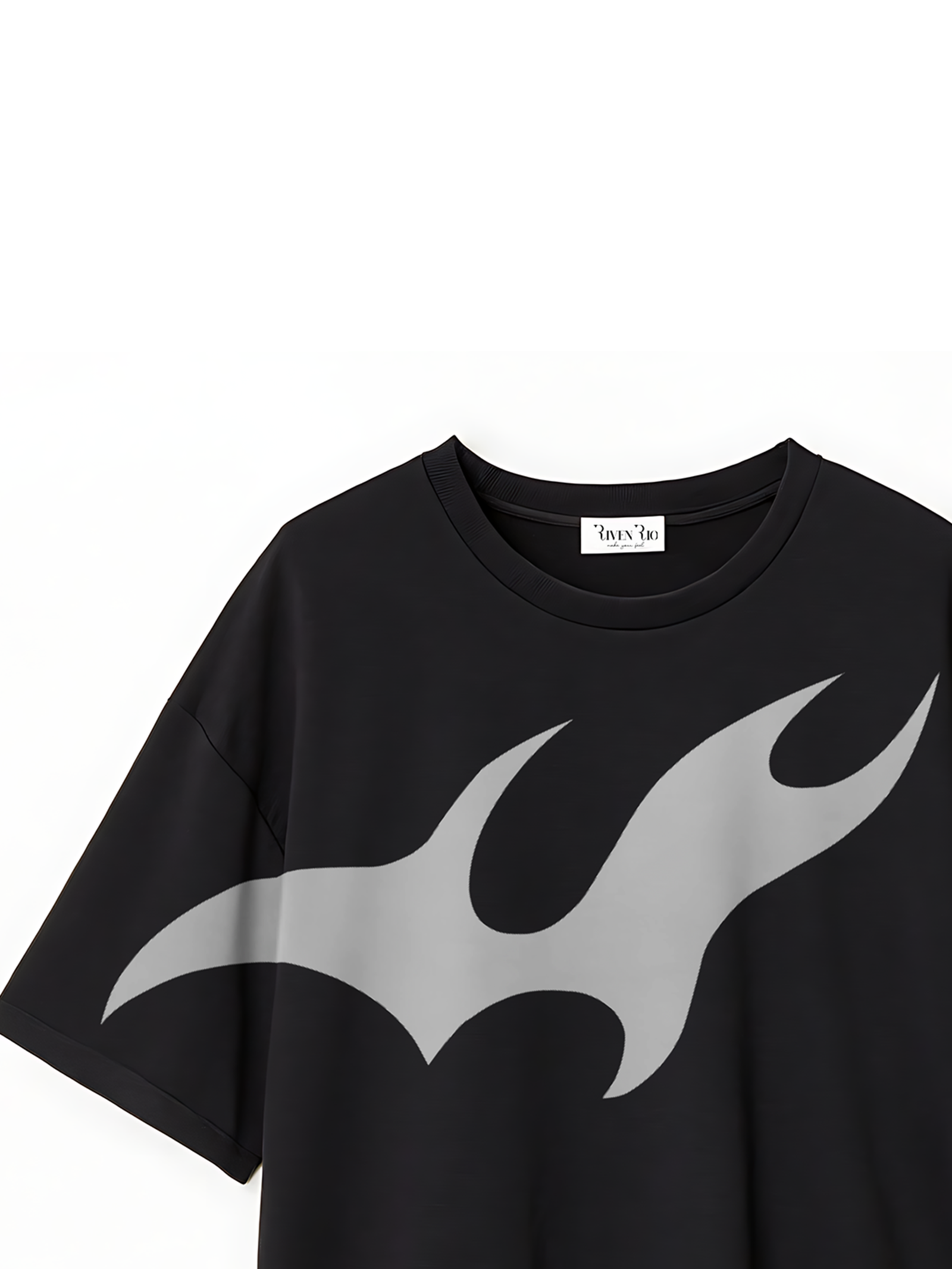 Street Wear Black Rond Neck Drop Shoulder Flame Graphic Print Oversize T-shirt. Stylish And Comfort. RivenRioOriginal