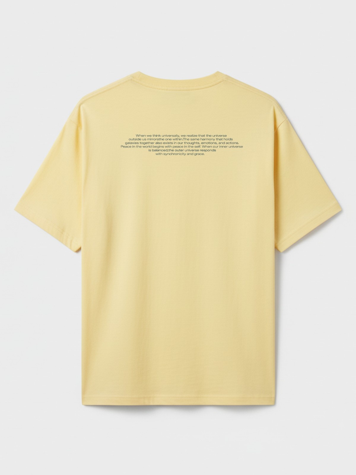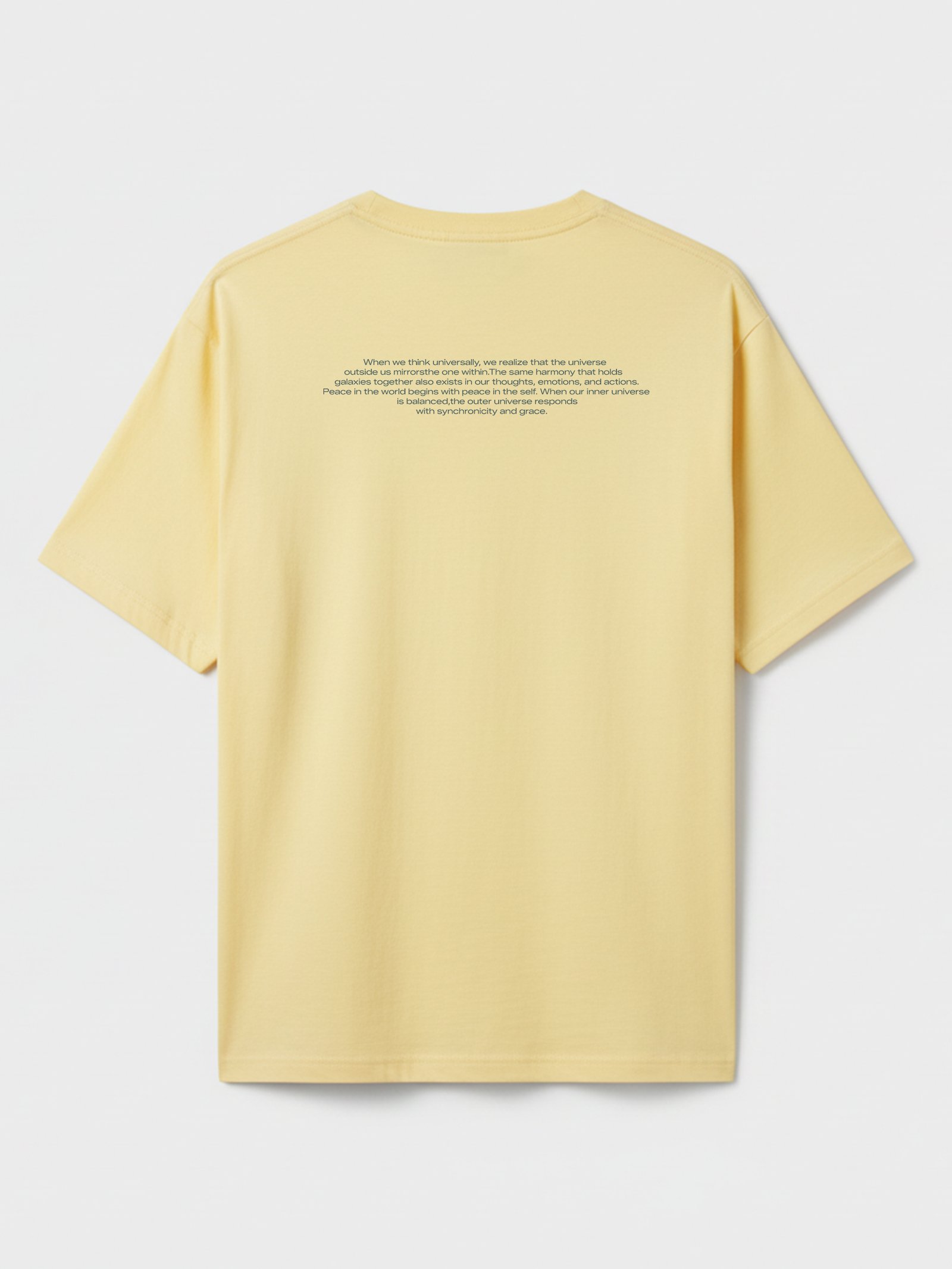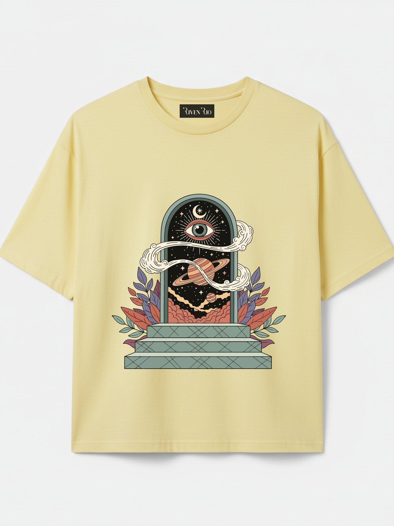 Step into a world of imagination with this pastel yellow oversized T-shirt featuring a mesmerizing cosmic window design. The central artwork showcases a surreal blend of an all-seeing eye, planets, and infinity symbols, framed by colorful leaves symbolizing curiosity, mystery, and universal thinking. Pastel Yellow oversized graphic T-shirt Soft cotton or cotton-blend fabric, breathable and comfortable. Stylish And Comfort. RivenRioOriginal