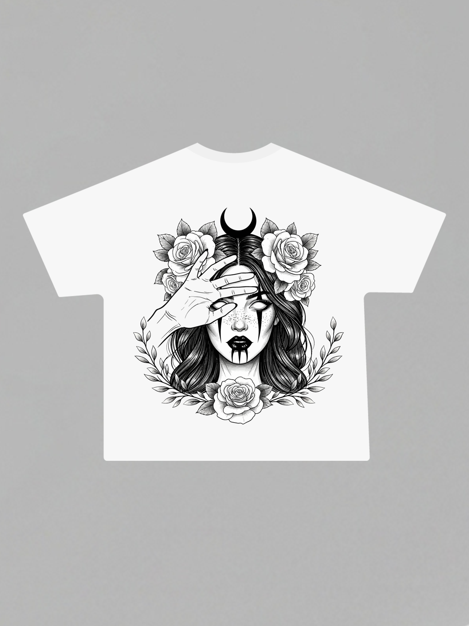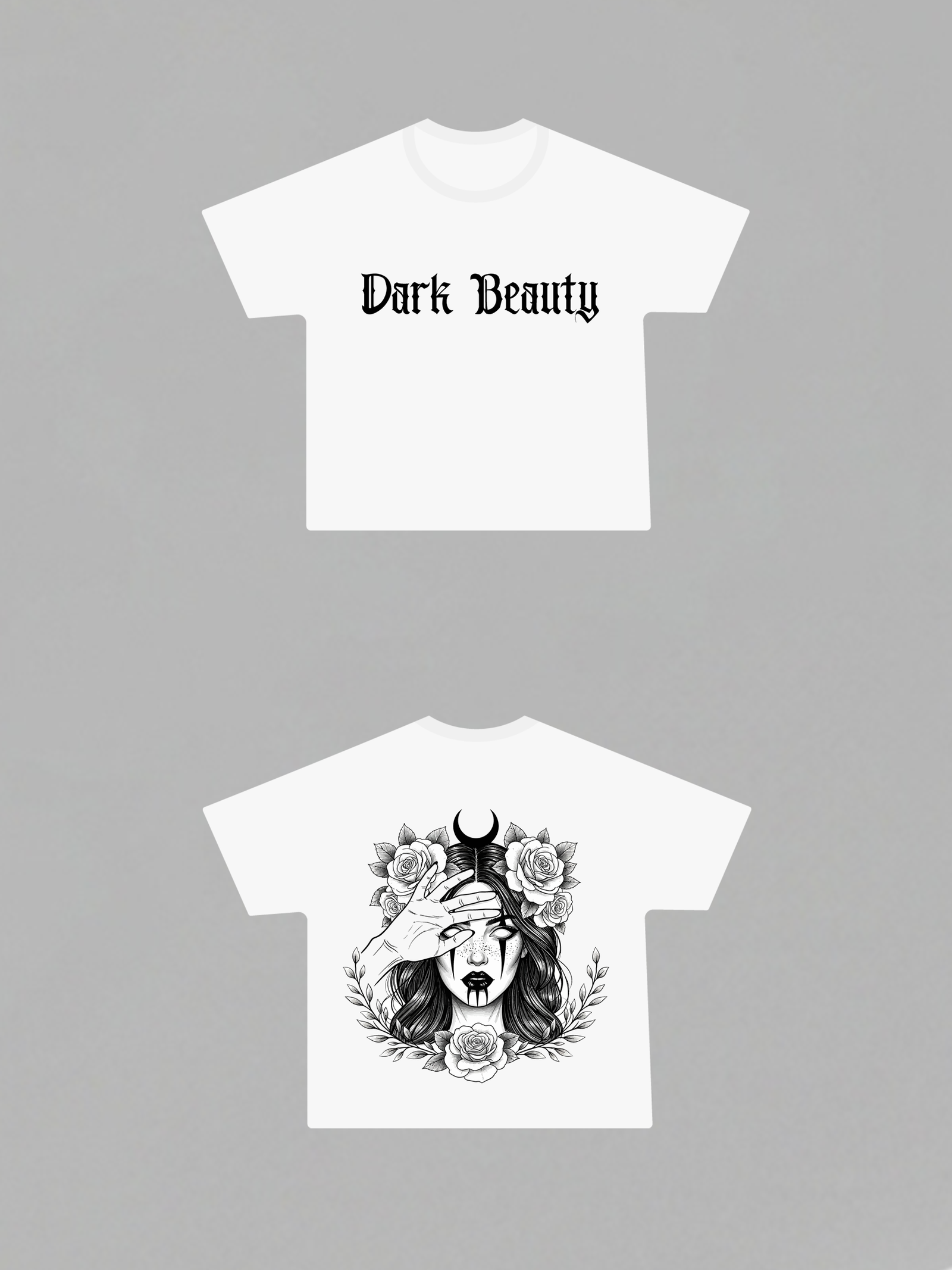 Street Wear White Rond Neck Drop Shoulder Dark Beauty Graphic Print Oversize T-shirt. Stylish And Comfort. RivenRioOriginal
