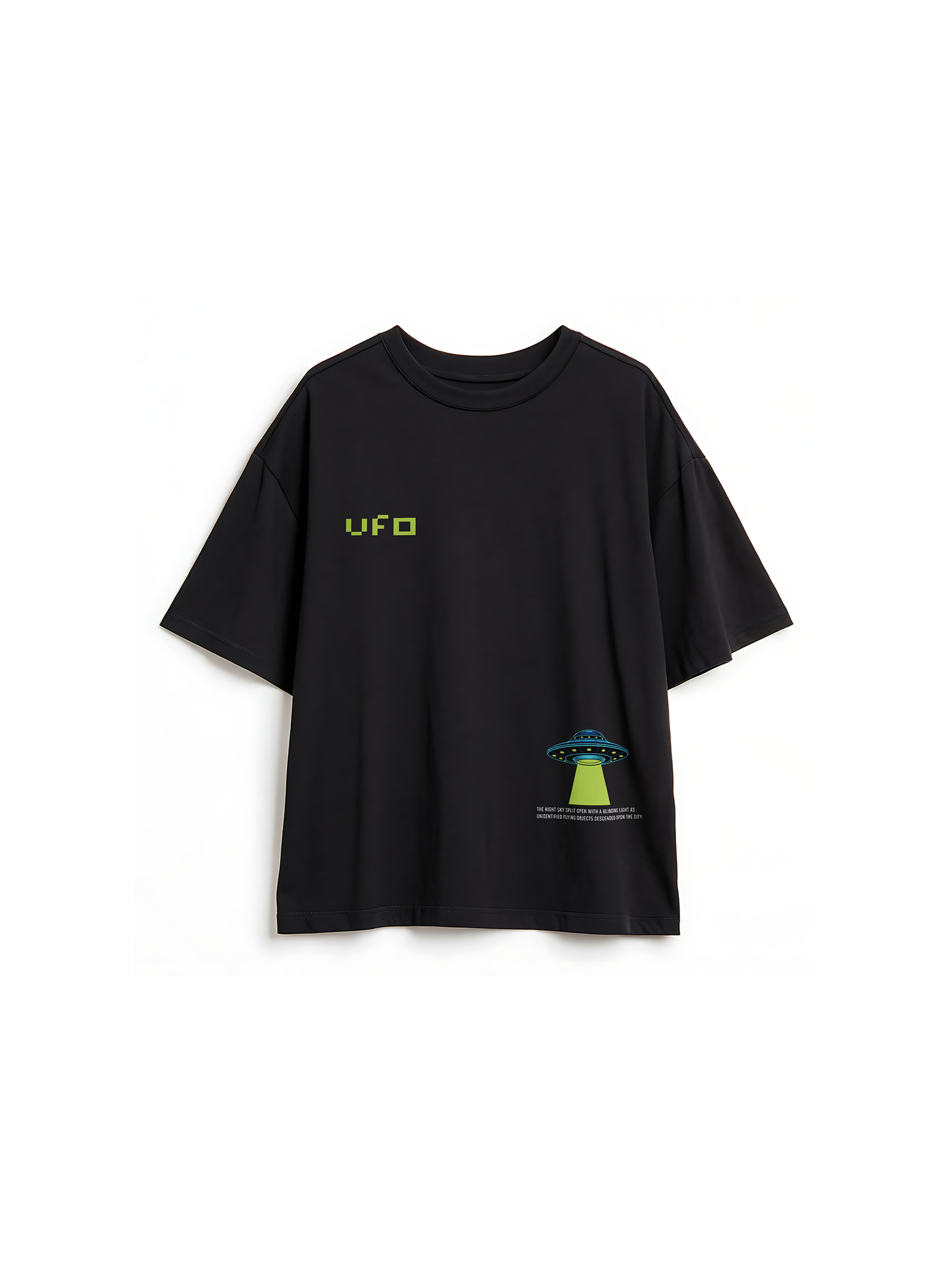Street Wear Black Rond Neck Drop Shoulder UFO Graphic Print Oversize T-shirt. Stylish And Comfort. RivenRioOriginal