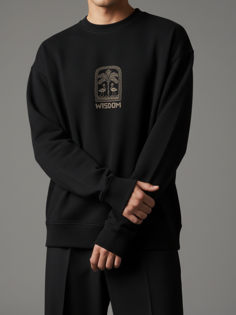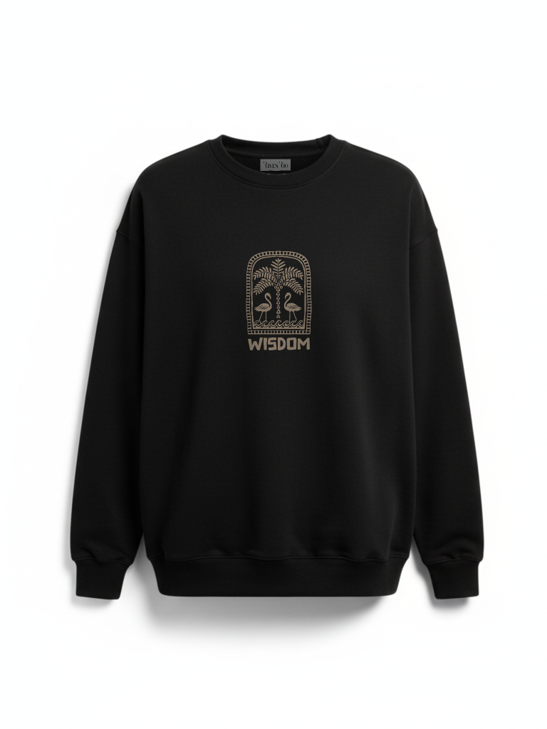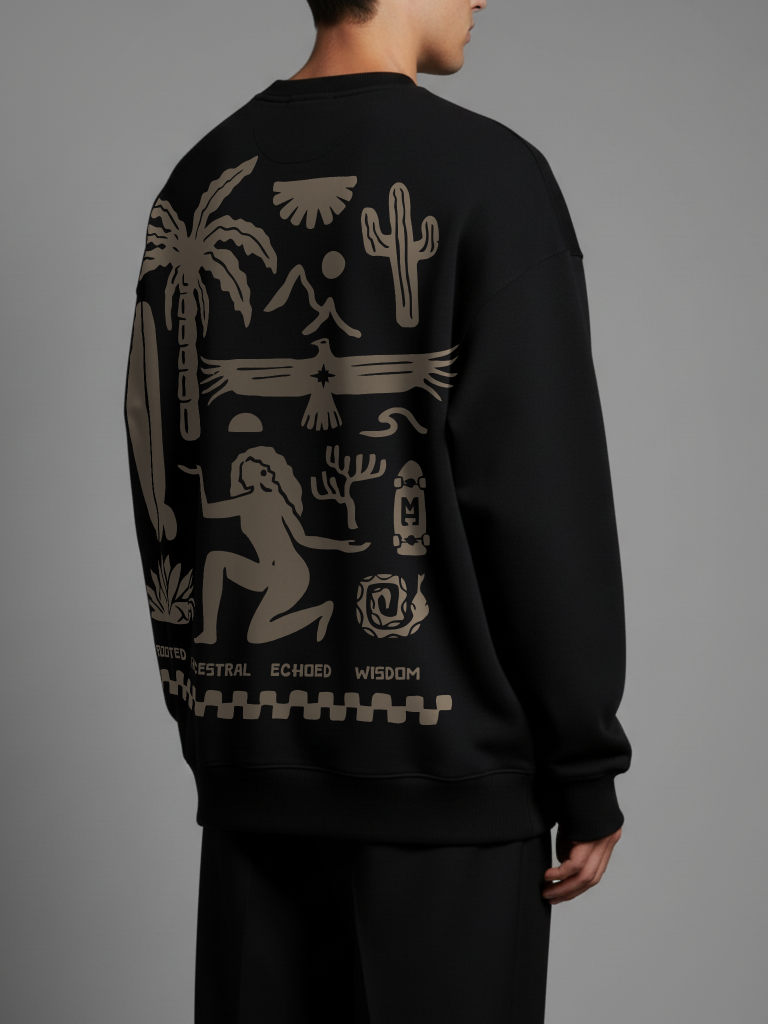 The Rooted Wisdom Sweatshirt celebrates ancestral energy and earthy minimalism. Crafted in premium cotton blend fabric, this piece features a striking tribal-inspired back print depicting natural symbols — palm trees, mountains, cacti, and spiritual figures — representing harmony between humanity and nature. The warm beige print on a deep black base brings an ancient, grounded aesthetic to modern streetwear. Stylish And Comfort. RivenRioOriginal