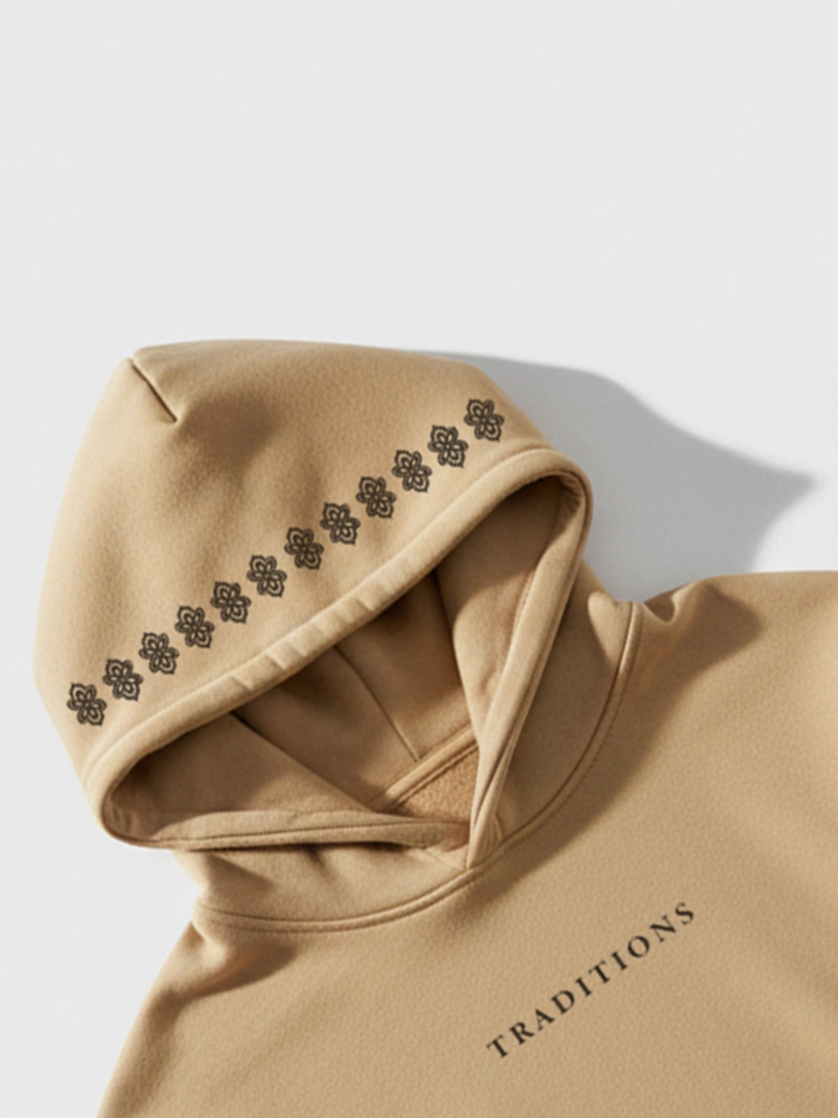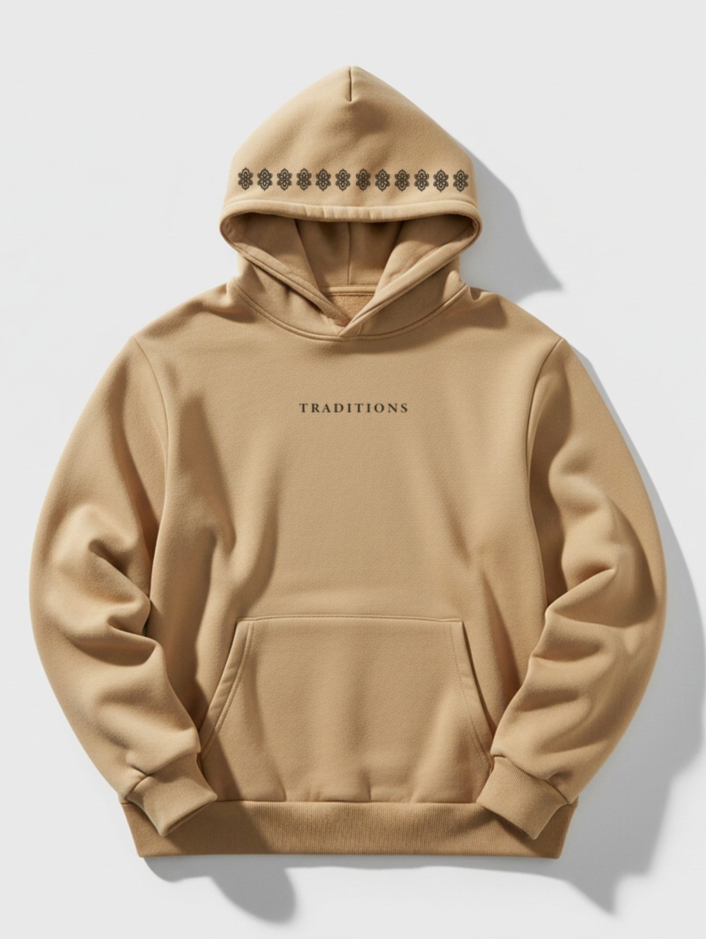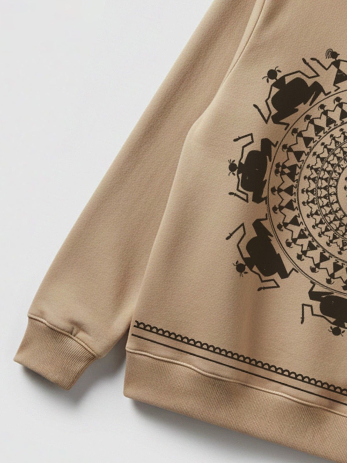 A beige hoodie featuring an intricate tribal mandala illustration inspired by traditional Indian folk art. The bold black artwork creates a striking cultural aesthetic while maintaining a modern streetwear vibe. RivenRioOriginal