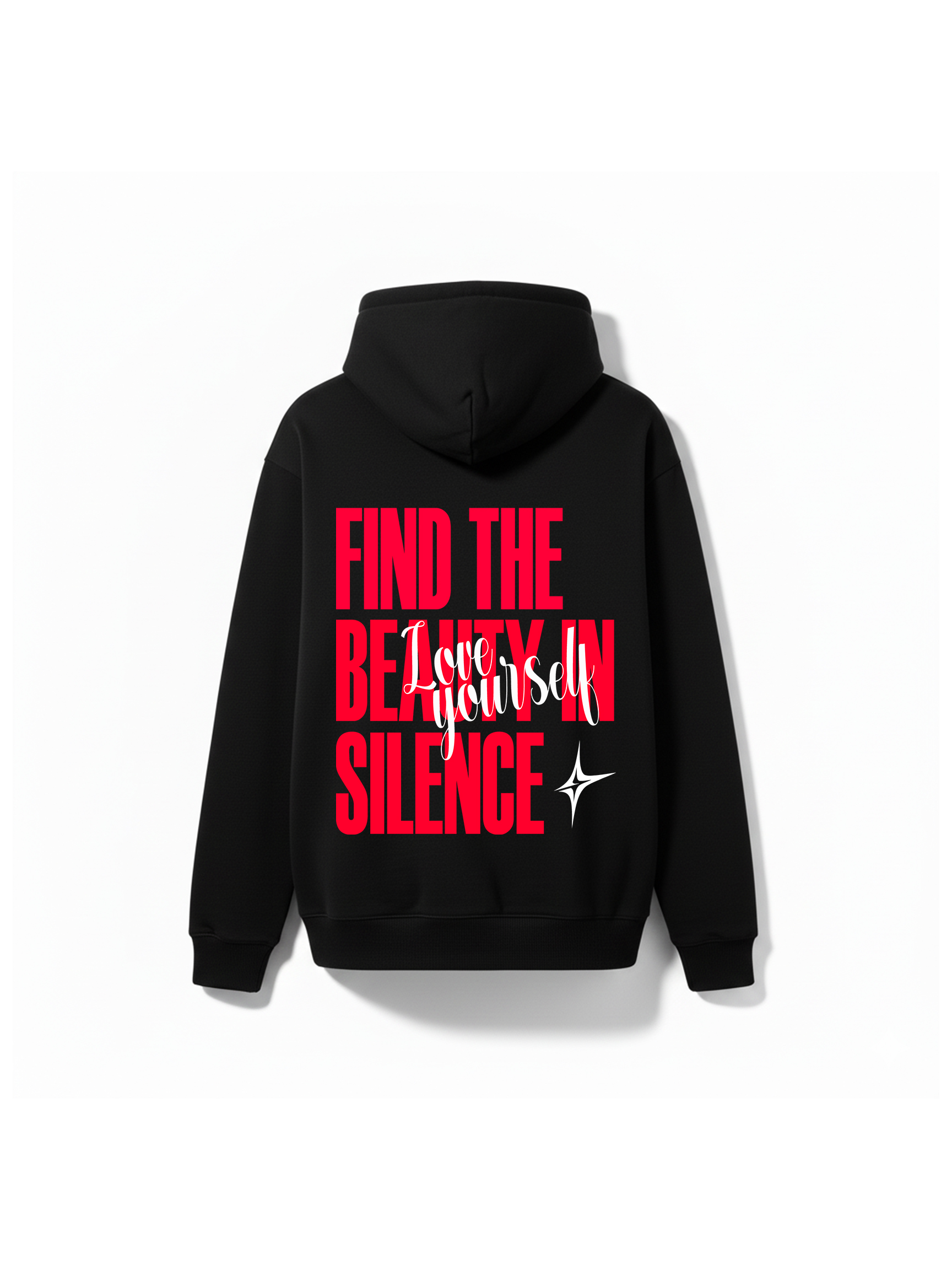 Step into confidence and calm with the Find the Beauty in Silence Hoodie a bold statement piece for those who embrace self-love and inner peace. Crafted in premium black cotton fleece, this hoodie features an empowering motivational quote printed in striking red and white typography. Stylish And Comfort. RivenRioOriginal