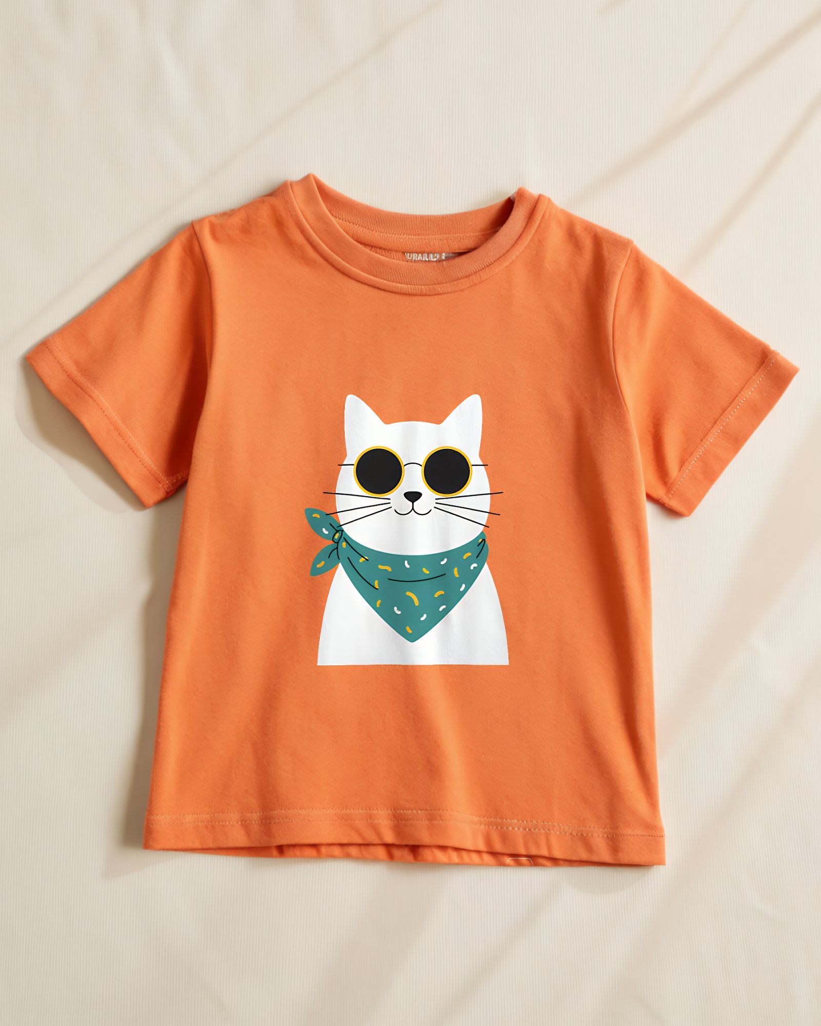 Orange Color Stylish Cat Printed T-shirt Pure Cotten. RivenRioOriginal