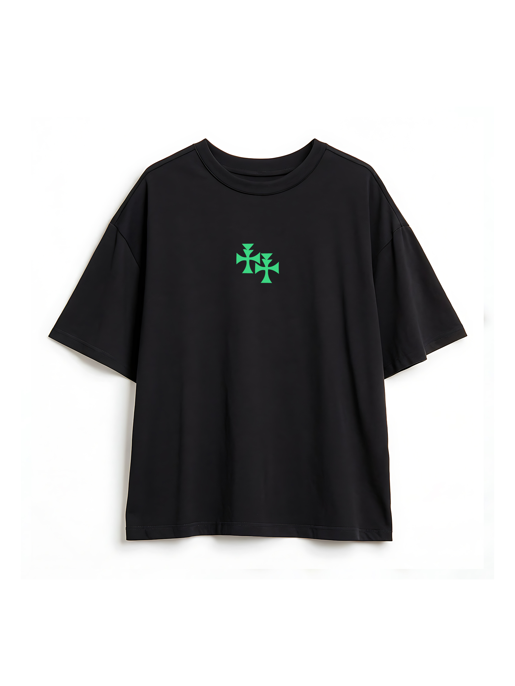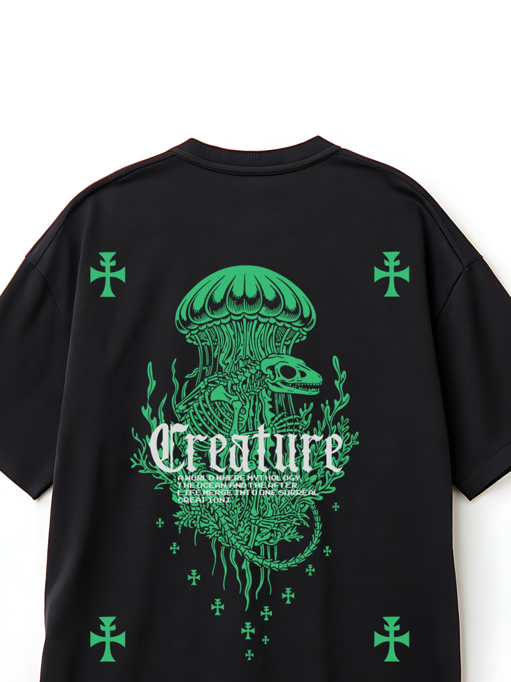 This black oversized tee features a striking neon-green artwork showcasing a mythical skeletal creature emerging from enchanted flora, crowned by a jellyfish-like spirit form. Surrounded by symbolic cross emblems, the design blends ancient tribal mysticism with modern streetwear. Black oversized graphic T-shirt Soft cotton or cotton-blend fabric, breathable and comfortable. Stylish And Comfort. RivenRioOriginal
