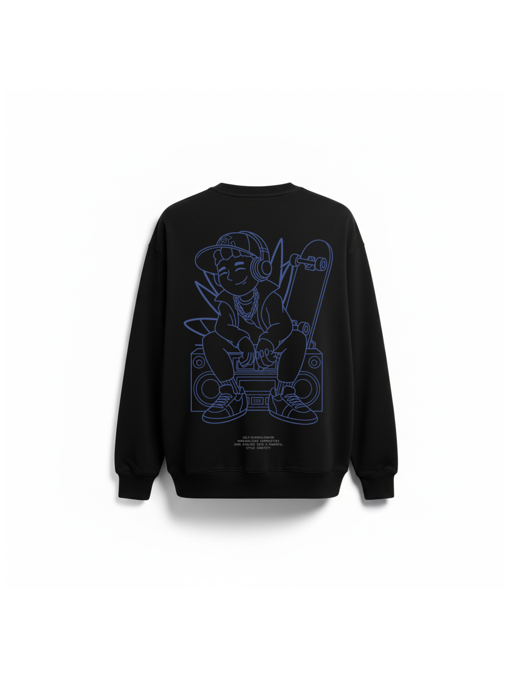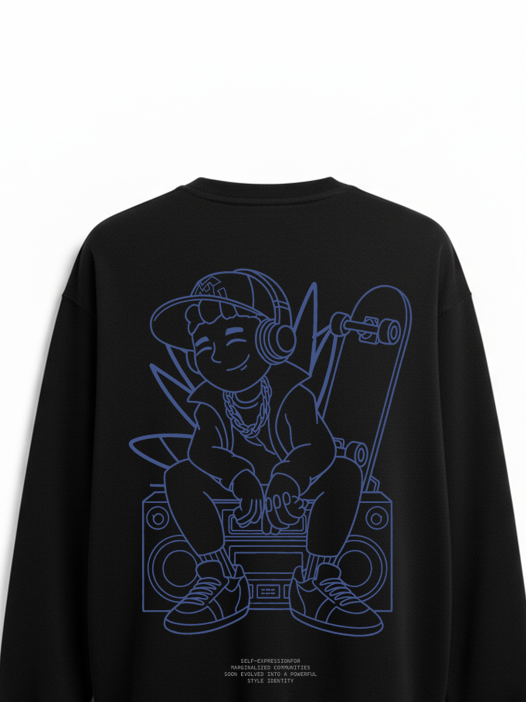 Elevate your street style with this Hip Hop Culture Graphic Sweatshirt, designed for those who live and breathe urban creativity. The front features a bold “Culture” typography framed in a modern box graphic, while the back showcases a detailed line-art illustration of a hip-hop kid—complete with headphones, chain, boombox, and skateboard. Made from premium soft cotton-blend fabric, this sweatshirt provides all-day comfort and effortless style. The clean blue outline design pops beautifully against the deep black base, giving it a fresh, artistic edge inspired by rap, skateboarding, graffiti, and old-school hip-hop energy. RivenRioOriginal