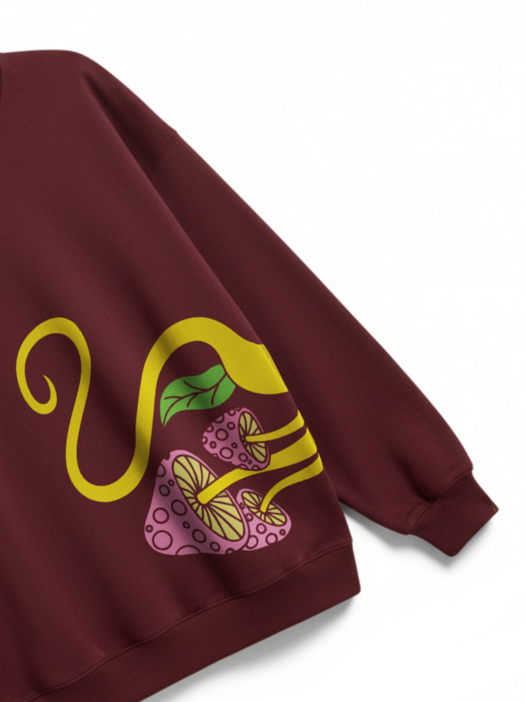 The Maroon “Floral Flow” Sweatshirt combines art and comfort in one striking piece. Featuring an abstract yellow vine and pink mushroom-inspired botanical illustration on the lower front, this sweatshirt stands out for its modern, artsy aesthetic. The bright, organic pattern contrasts beautifully with the deep maroon base, creating a look that’s both bold and sophisticated. Stylish And Comfort. RivenRioOriginal