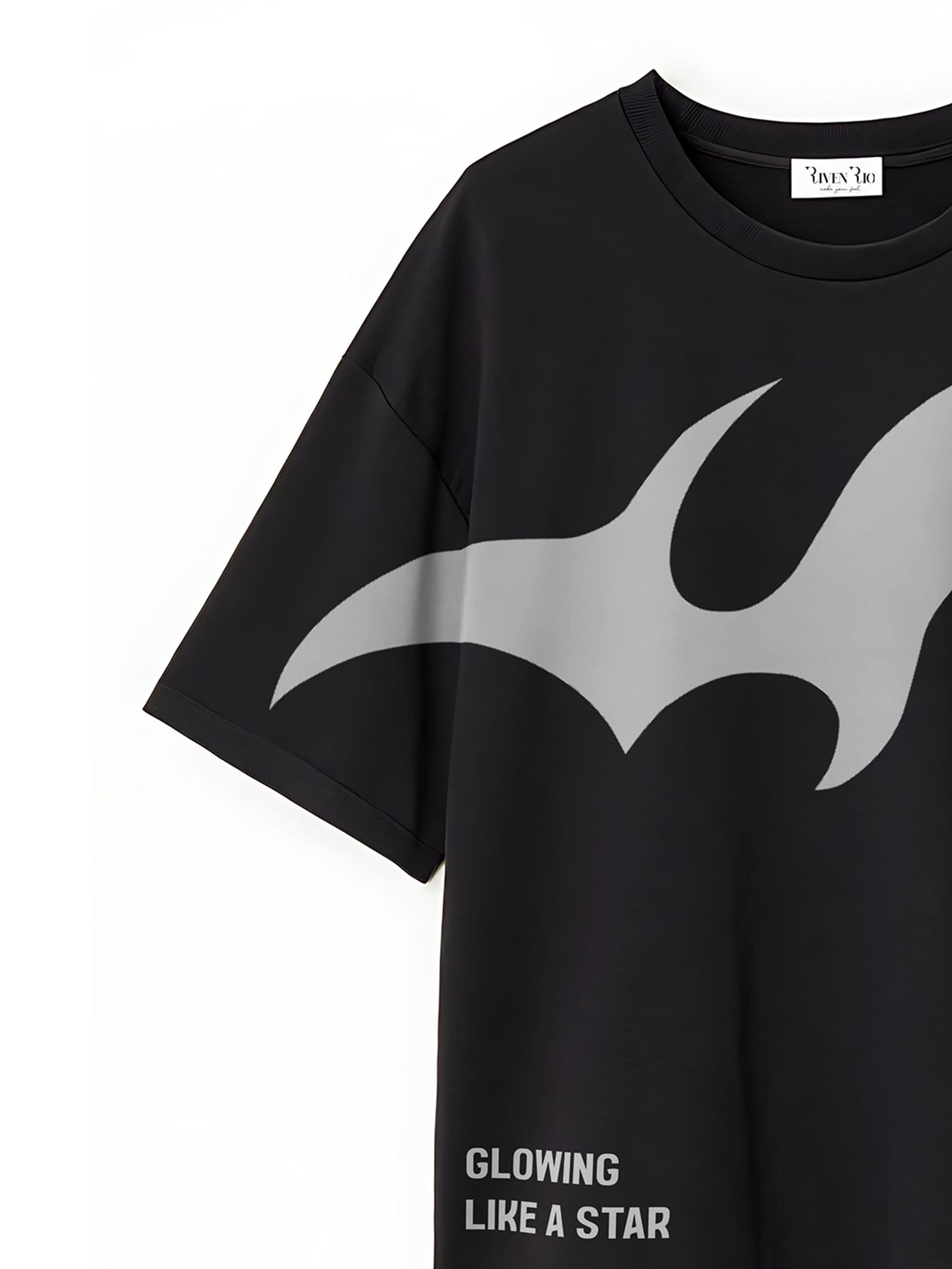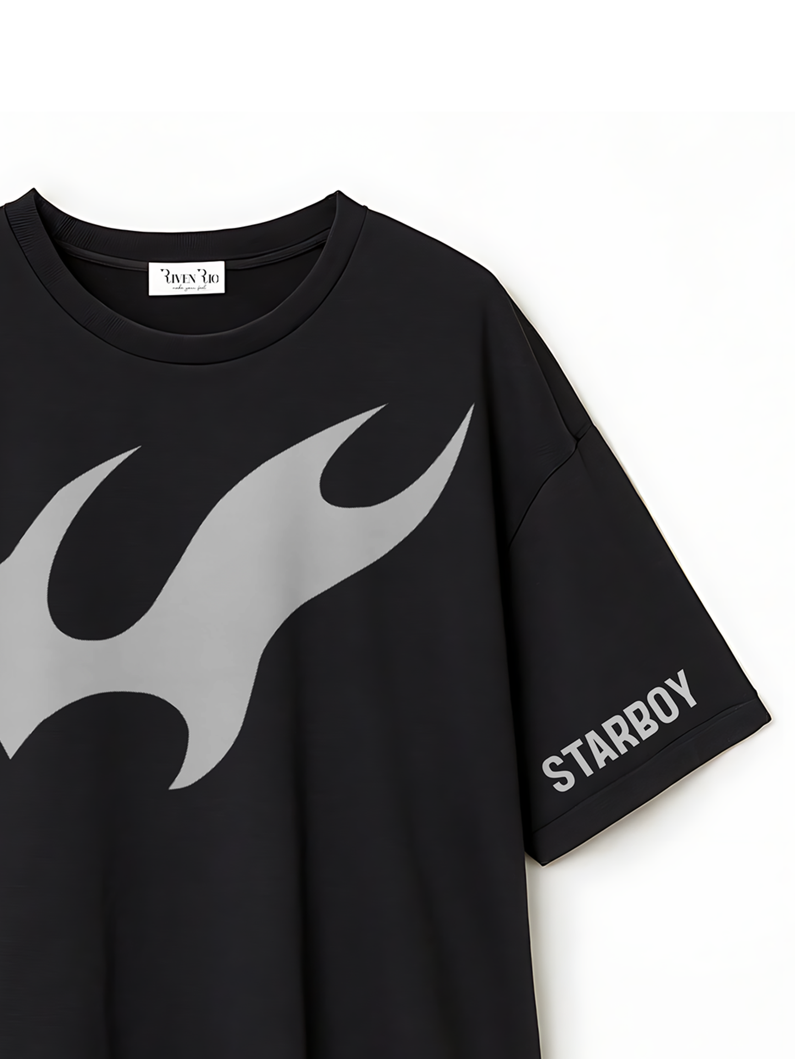 Street Wear Black Rond Neck Drop Shoulder Flame Graphic Print Oversize T-shirt. Stylish And Comfort. RivenRioOriginal