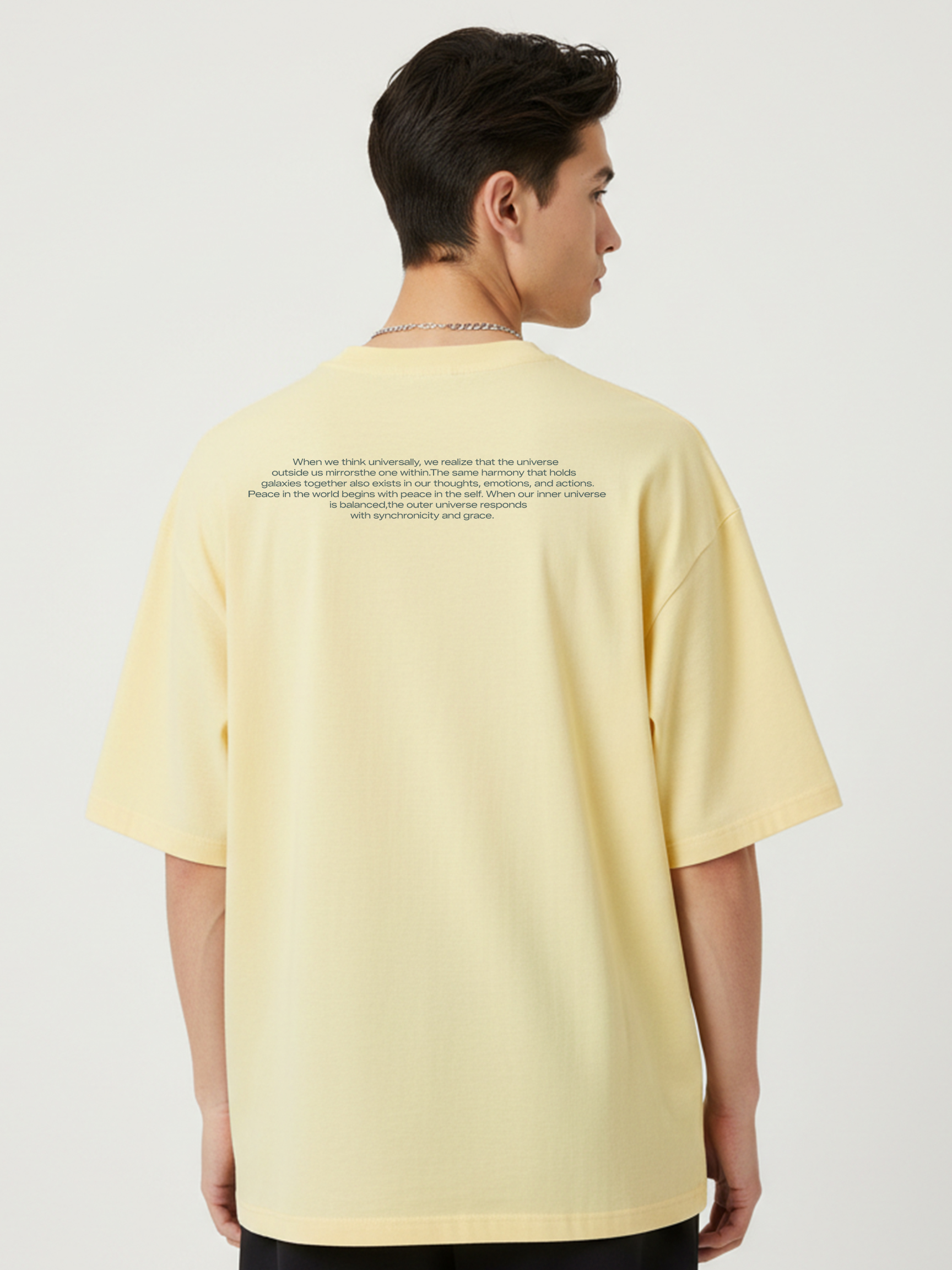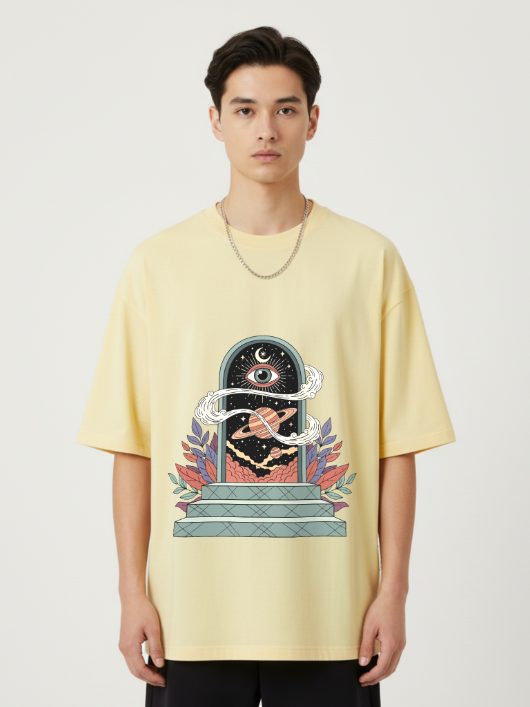 Step into a world of imagination with this pastel yellow oversized T-shirt featuring a mesmerizing cosmic window design. The central artwork showcases a surreal blend of an all-seeing eye, planets, and infinity symbols, framed by colorful leaves symbolizing curiosity, mystery, and universal thinking. Pastel Yellow oversized graphic T-shirt Soft cotton or cotton-blend fabric, breathable and comfortable. Stylish And Comfort. RivenRioOriginal