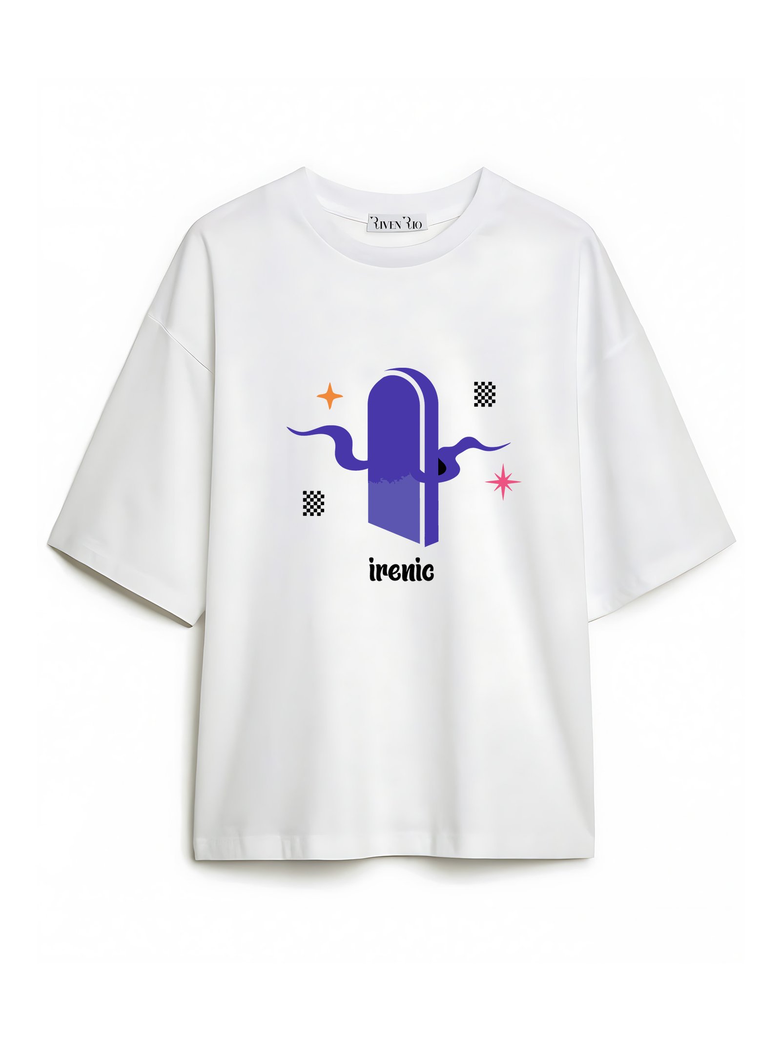 The main design on the front features a stylized, dark purple, arched shape resembling a doorway or gate. The design on the back is more elaborate than the front and features a similar aesthetic with two opposing shapes, hands, and other abstract elements. White oversized graphic T-shirt Soft cotton or cotton-blend fabric, breathable and comfortable. Stylish And Comfort. RivenRioOriginal