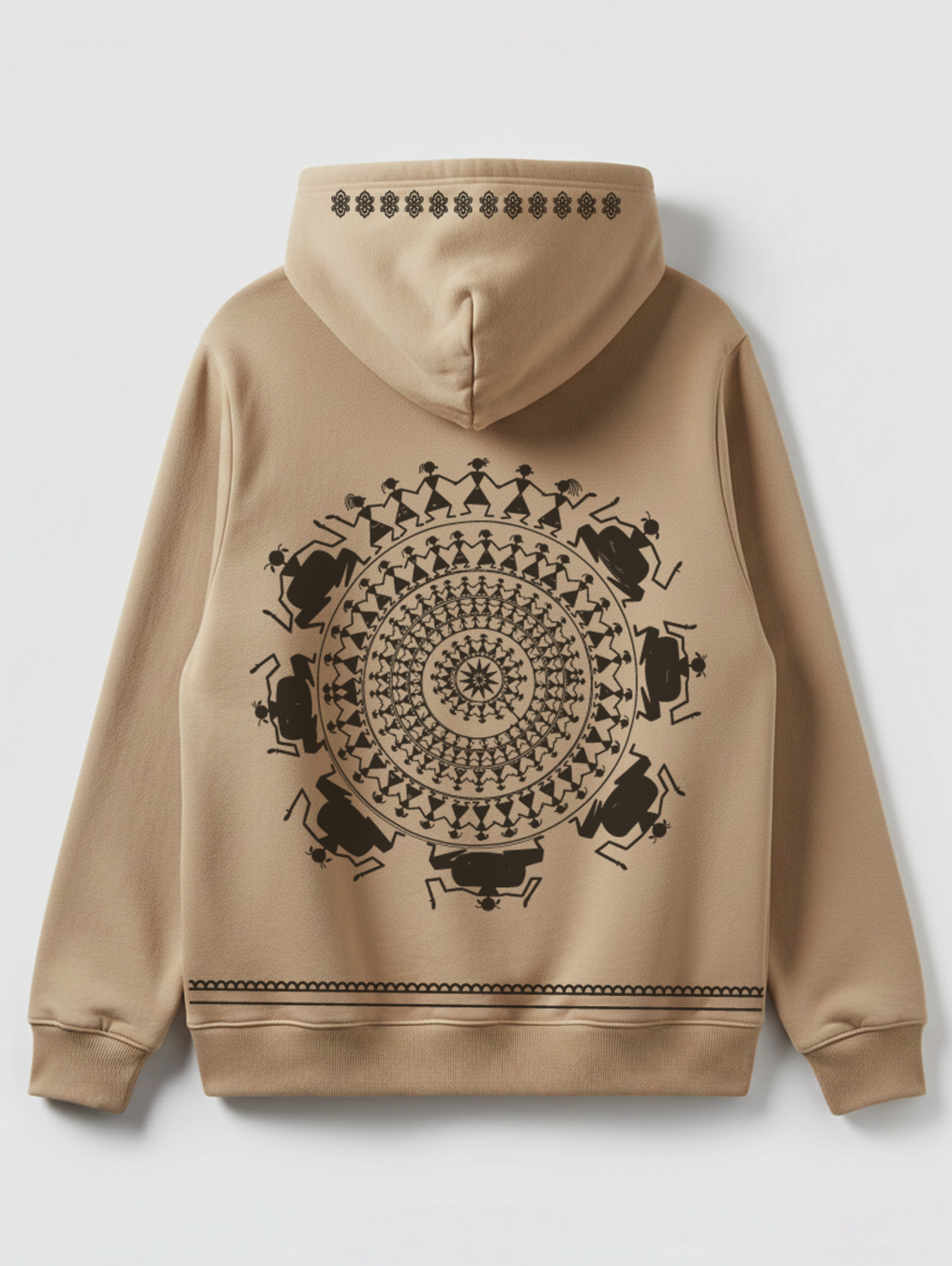 A beige hoodie featuring an intricate tribal mandala illustration inspired by traditional Indian folk art. The bold black artwork creates a striking cultural aesthetic while maintaining a modern streetwear vibe. RivenRioOriginal